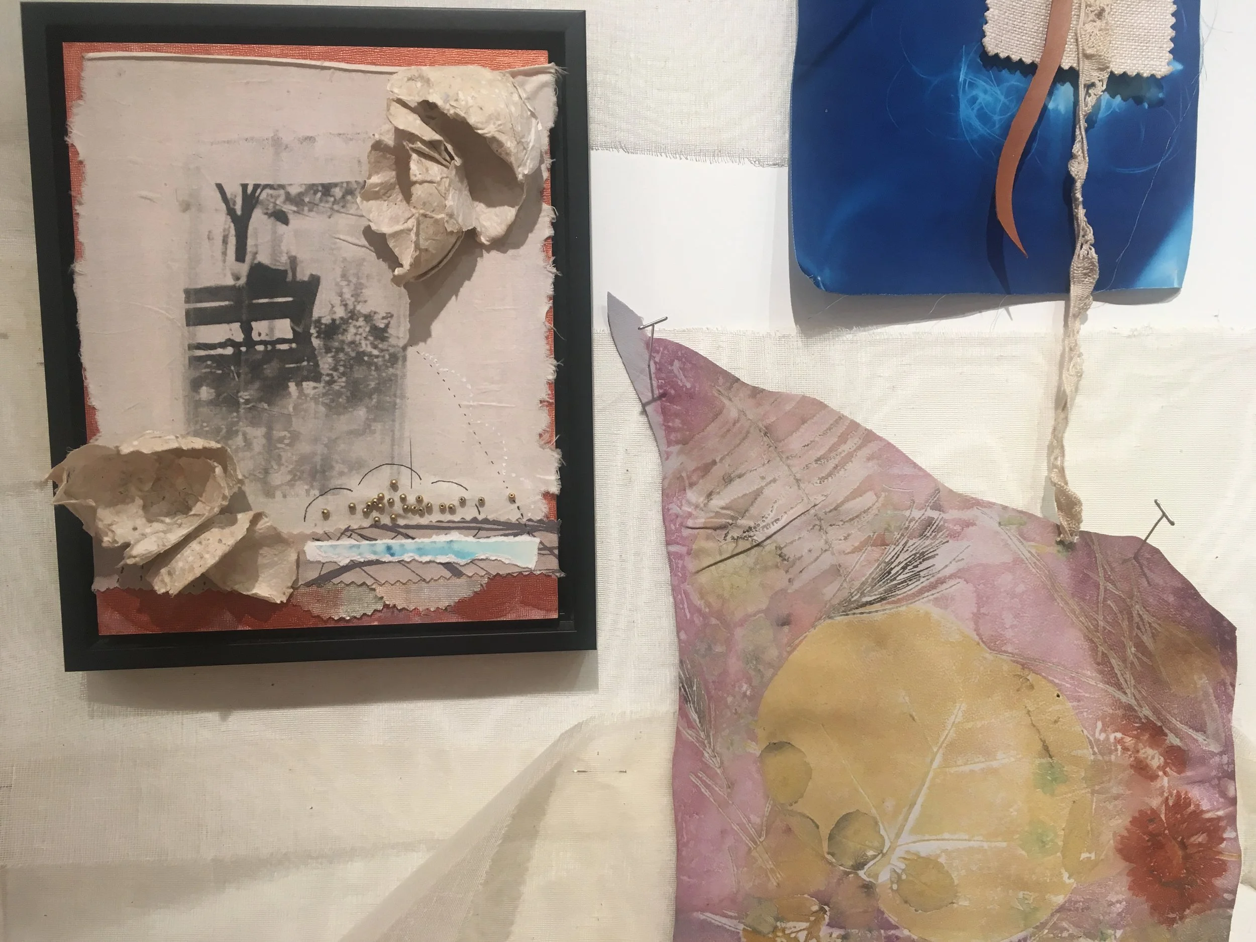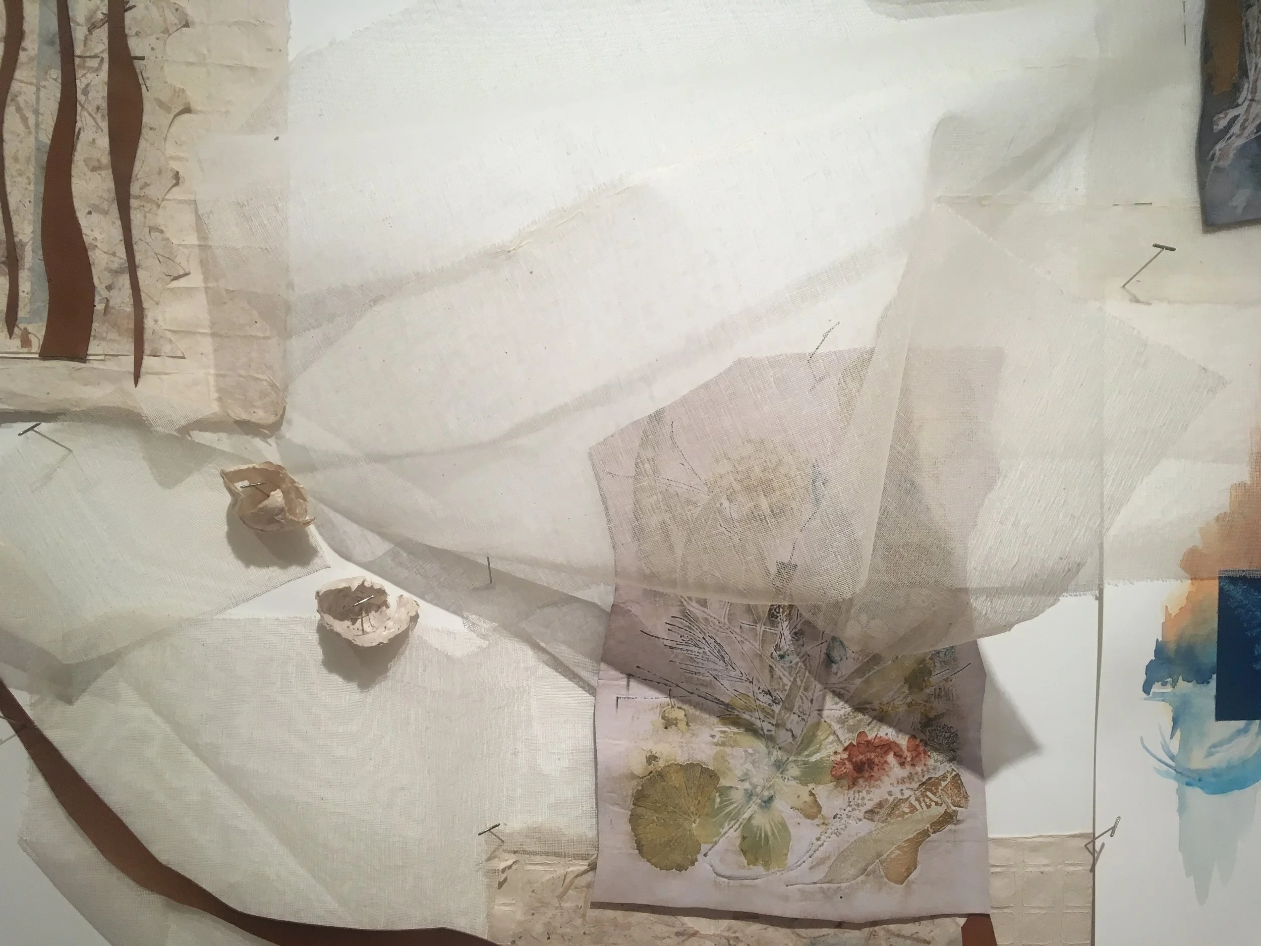 6’ x 5’ total. Materials include - drawing, handmade paper, eco-printing on leather, inko-dye, cyanotype, liquid emulsion on fabric, sewing, fabric, watercolor, weaving, collage on paper.